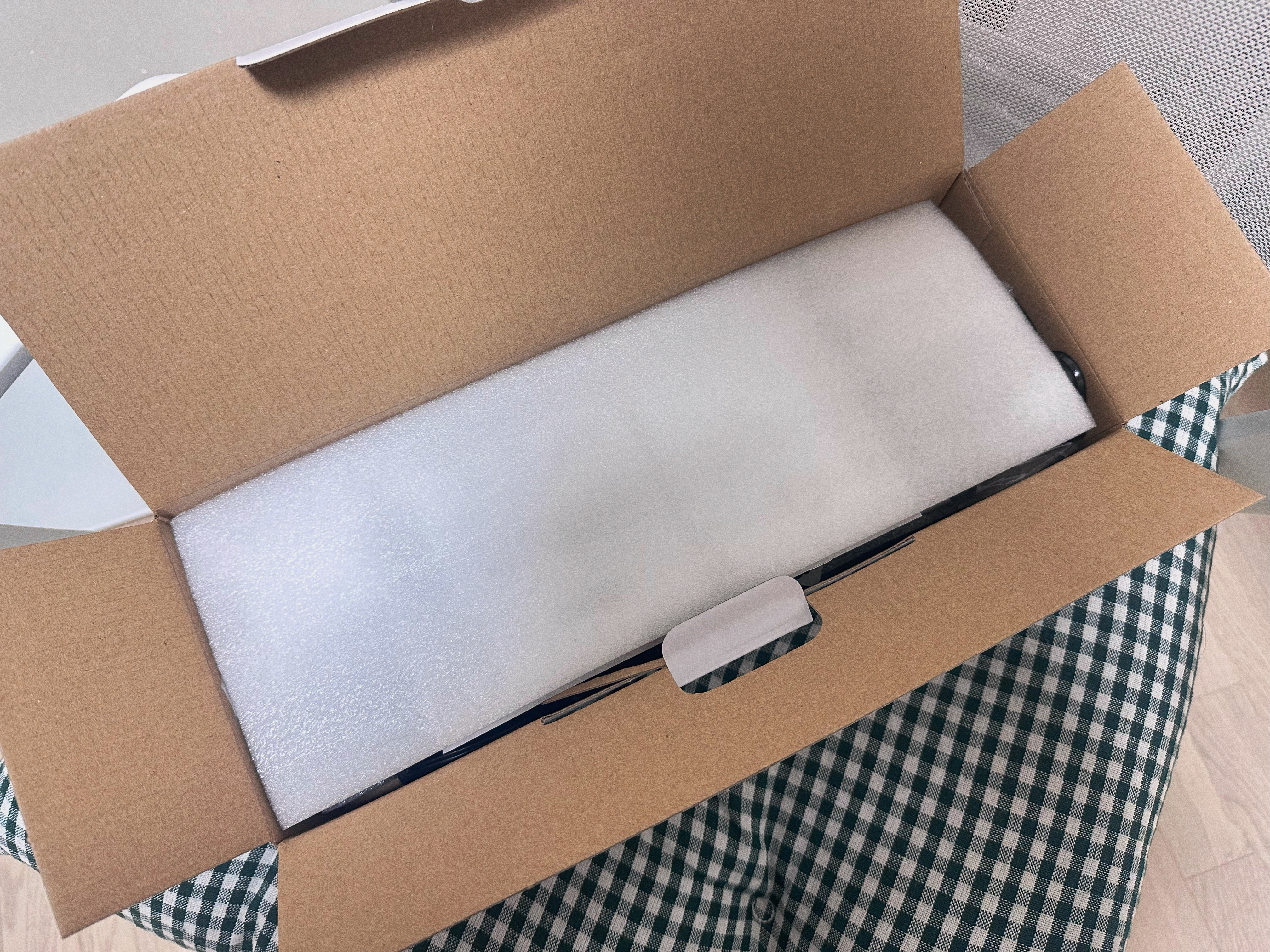 박스를 열면 이렇게 얇은 스티로폼이 한 겹 올려져있다.