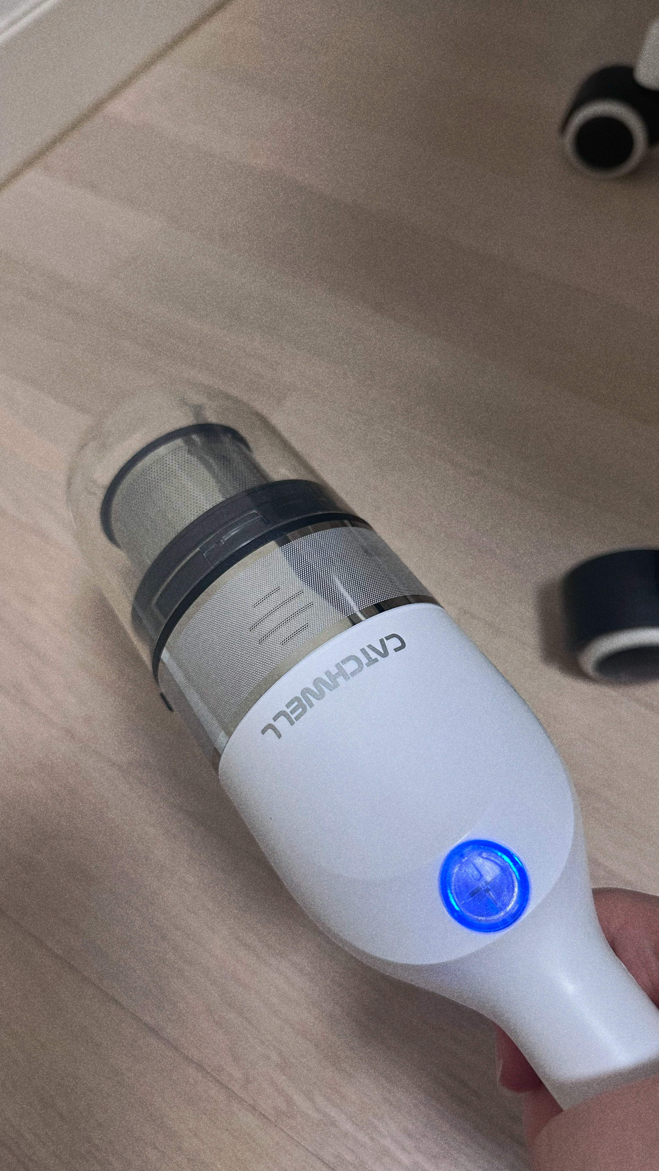 아까 충전할 때 빨간 불이 들어오던 부분이 바로 전원이다. 전원을 한 번 누르면 흡입이 가능하다. 실수로 두 번 눌러봤는데 강도가 강해지더라. 강도는 2단계까지 있는 걸 알게되었는데 1단으로도 아주 충분하다.
